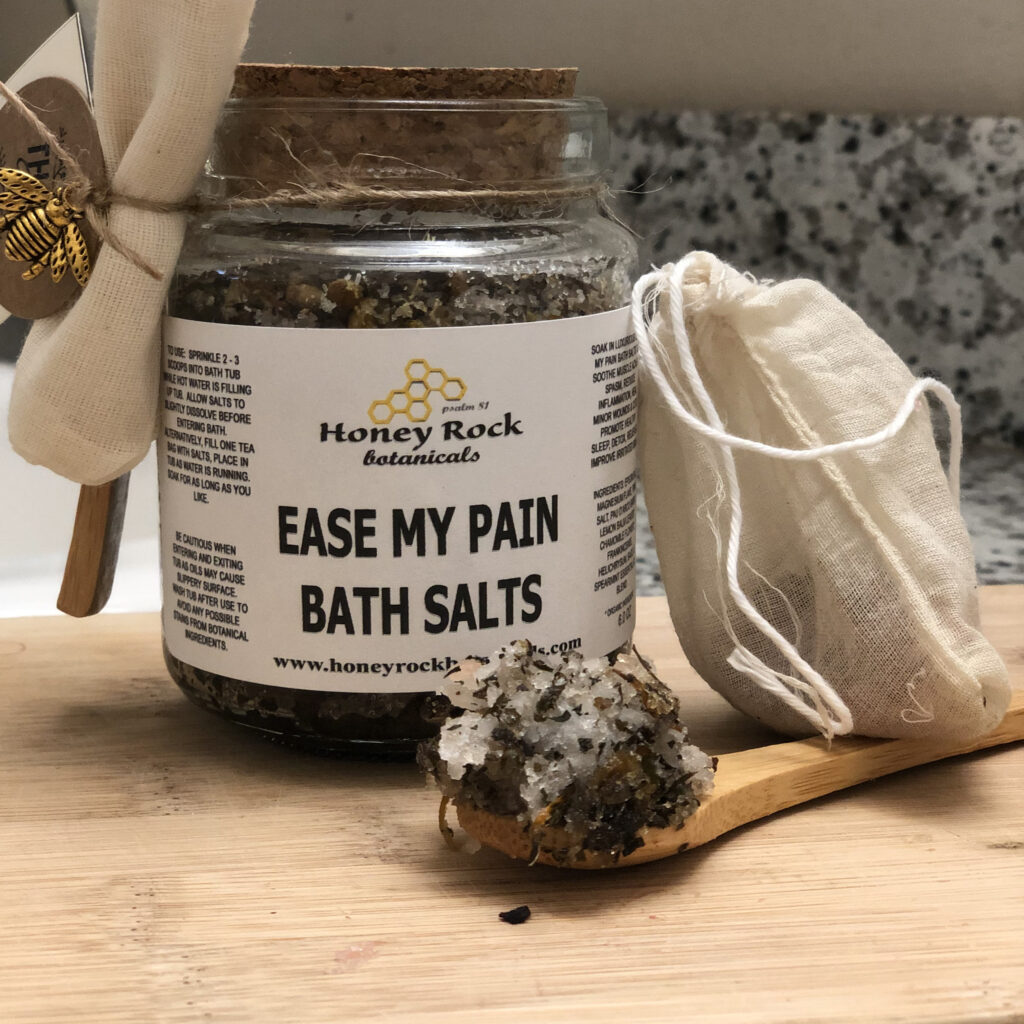 Soak in luxurious Ease My Pain Bath Salts to soothe muscle ache & spasm, reduce inflammation, heal minor wounds & cuts, promote healthy sleep, detox, relieve & improve irritated skin. Bath Salts come with two reusable organic cotton bath tea bags. Sprinkle 2 – 4 spoons full of botanical salt blend into hot bath water or fill the tea bag and soak it in your hot bath. Relax and ease muscle pain and tension away with every soak.